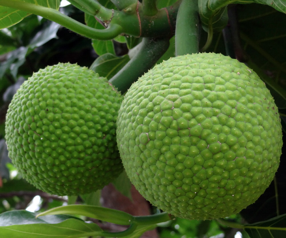 Breadfruit fruits mature 4-5 months after flowering; harvest when skin turns yellow-green and slightly soft.
